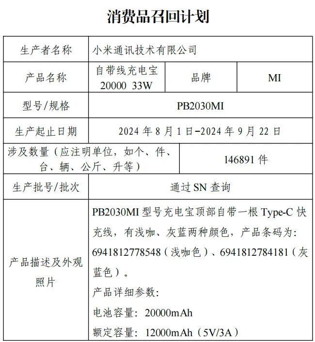 小米通讯技术有限公司按照《消费品召回管理暂行规定》的要求,向北京市市场监督管理局报告了召回计划,主动召回2024年8月1日至2024年9月22日期间制造的部分MI牌自带线充电宝20000 33W(型号:PB2030MI),涉及数量为146891件。