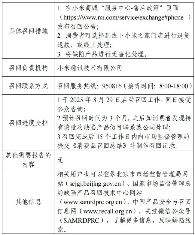 小米通讯技术有限公司将通过免费为消费者退货退款的形式开展缺陷产品召回工作,以消除安全隐患。