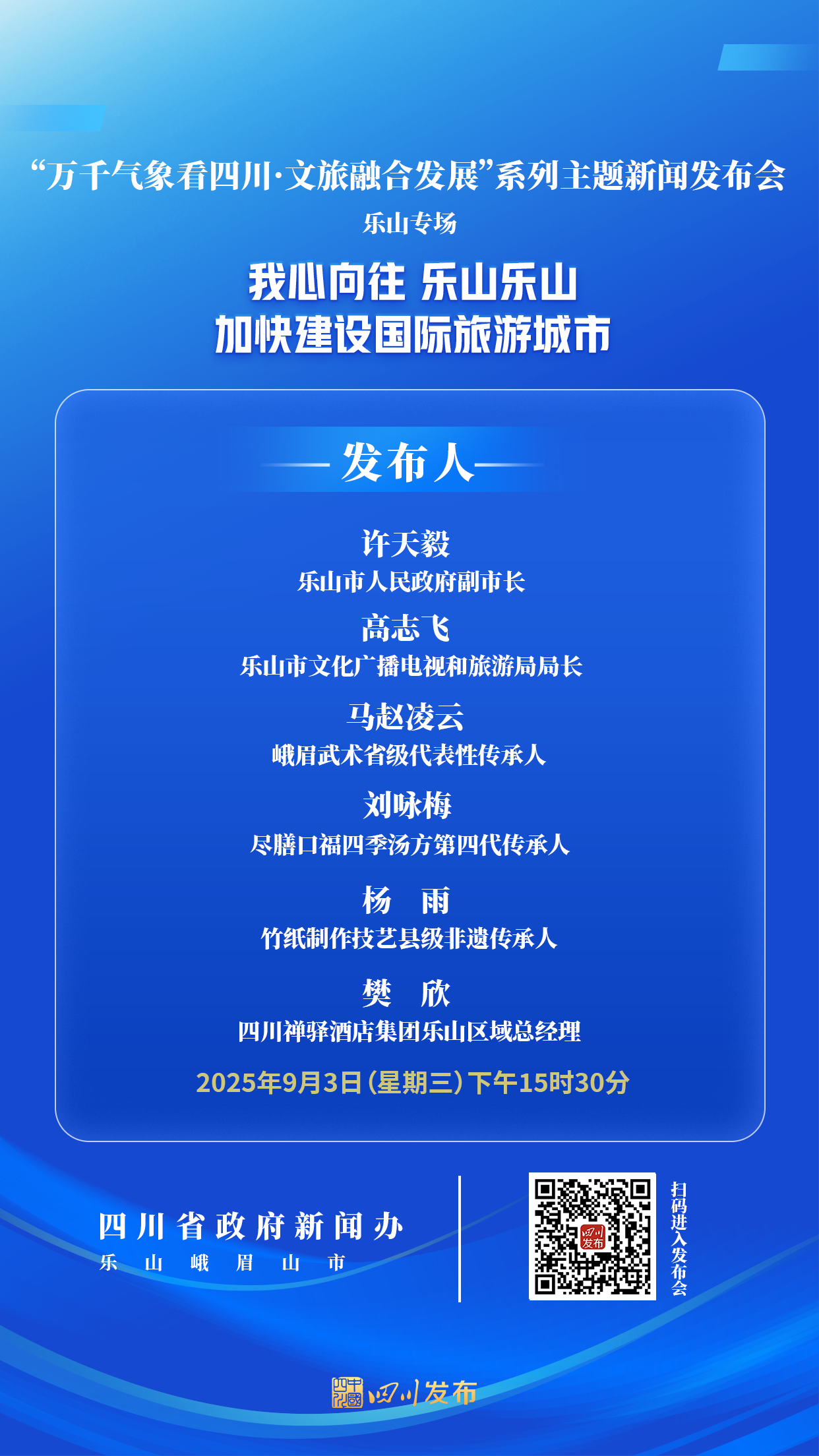 2025年9月3日(星期三)15:30,省政府新闻办将在乐山峨眉山市举行“万千气象看四川·文旅融合发展”系列主题新闻发布会乐山专场,乐山市人民政府副市长许天毅围绕“我心向往 乐山乐山,加快建设国际旅游城市”作介绍,乐山市文化广播电视和旅游局局长高志飞,峨眉武术省级代表性传承人马赵凌云,尽膳口福四季汤方第四代传承人刘咏梅,竹纸制作技艺县级非遗传承人杨雨,四川禅驿酒店集团乐山区域总经理樊欣答记者问。四川发布客户端将全程图文直播,敬请关注!