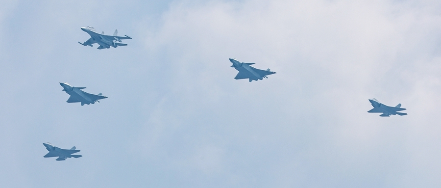 9月3日上午,歼击机梯队飞过天安门广场上空,接受祖国和人民检阅。梯队由歼-16D、歼-20、歼-20A、歼-20S、歼-35A组成。
