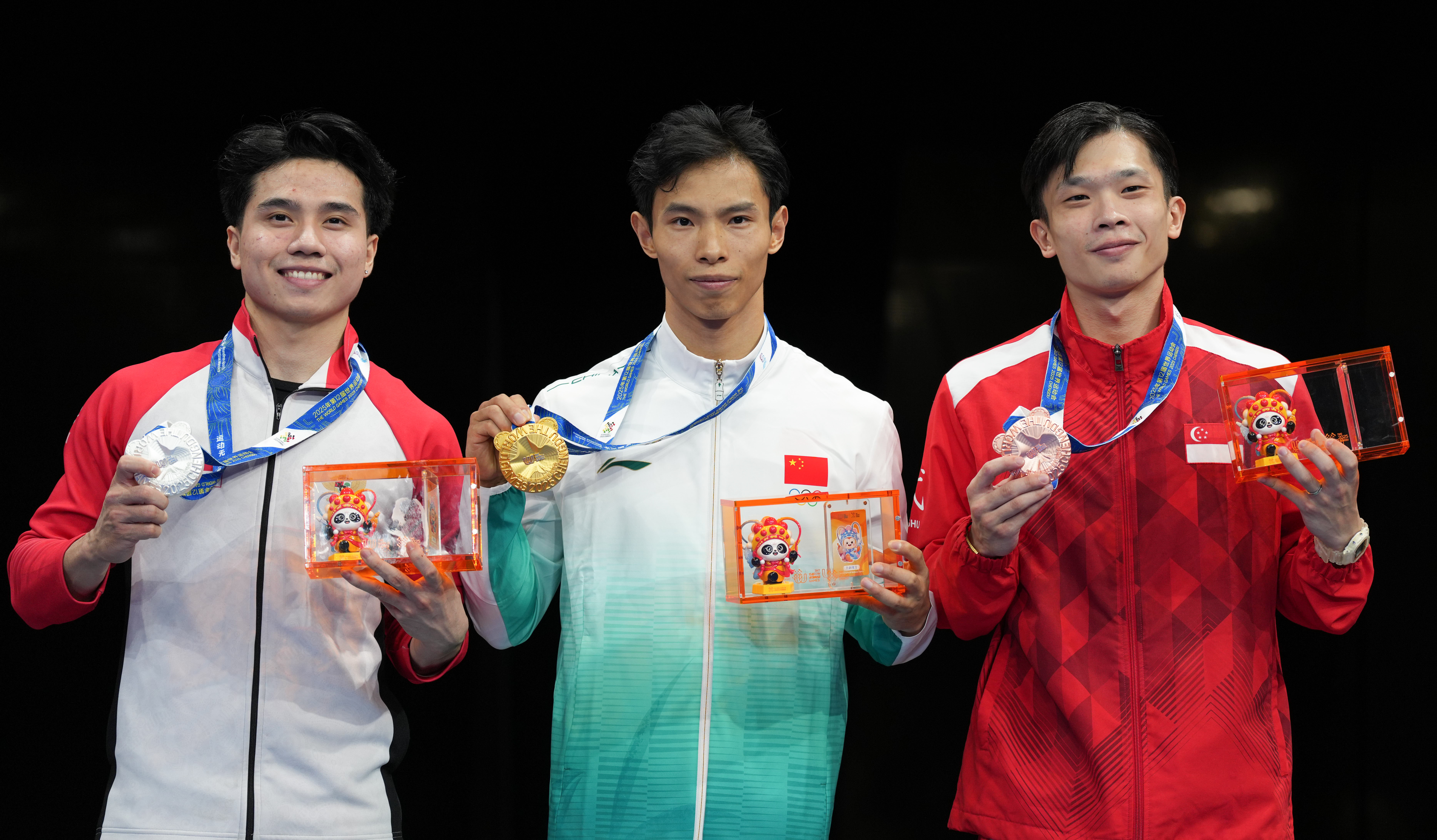 2025年成都世运会男子长拳-刀术-棍术决赛在成都高新体育中心举行。冠军中国选手高久尚(中)、亚军印度尼西亚选手西雷加尔(左)和季军新加坡选手林思韦在颁奖仪式上。新华社记者 徐速绘 摄