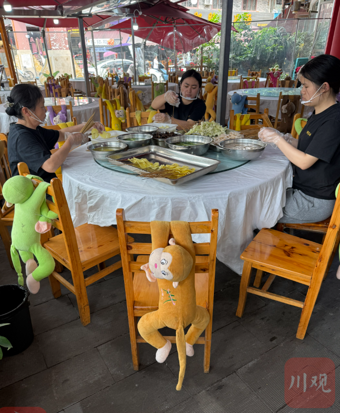 当地餐饮生意火爆,店员趁着饭点前串钵钵鸡